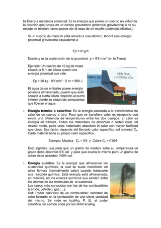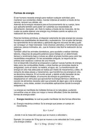 El documento describe las diferentes formas en que se manifiesta la energía en la naturaleza, incluyendo la energía mecánica, térmica, química, radiante, nuclear y eléctrica. También explica los principios de conservación de la energía y las diferentes fuentes de energía, renovables como la hidráulica, solar y eólica, y no renovables como los combustibles fósiles y la energía nuclear.