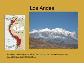 Los Andes son una cordillera montañosa en Sudamérica que alcanza los 6,000 metros de altitud, con el Aconcagua como su cumbre más alta. Los Apalaches son un sistema montañoso en el este de Norteamérica con alturas entre 460 y 2,130 metros. La isla de Borneo pertenece políticamente a Indonesia, Malasia y Brunei y alberga una selva virgen e inexplorada.