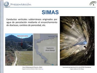 Este documento describe diferentes características geológicas subterráneas como simas, cavernas, galerías y espeleotemas. Explica que las simas son conductos verticales originados por el agua subterránea, y que las galerías pueden ser activas, freáticas o vadosas dependiendo de cómo circula el agua. También describe diversas formaciones como estalactitas, estalagmitas, columnas y gours que se forman debido a la precipitación de carbonatos cuando el agua circula por las cavidades. Finalmente,