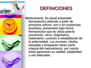 El documento define las formas farmacéuticas, principios activos y excipientes. Explica que las formas farmacéuticas sólidas incluyen polvos, granulados, cápsulas y tabletas. Las formas semi-sólidas son pomadas, pastas y cremas. Las formas líquidas incluyen soluciones, inyecciones, jarabes, emulsiones y suspensiones. Las formas gaseosas son aerosoles, nebulizadores e inhaladores de polvo seco.