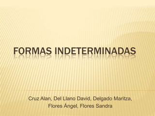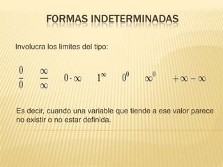 Este documento trata sobre formas indeterminadas y la regla de L'Hopital. Explica diferentes tipos de formas indeterminadas como 0/0, ∞/∞, 0*∞ y cómo usar la regla de L'Hopital para resolver los límites indeterminados aplicando derivadas. También incluye ejemplos resueltos de cada tipo de forma indeterminada.