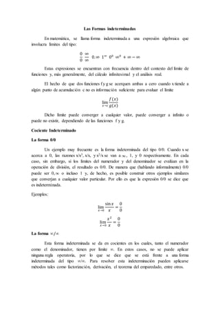 Este documento explica las formas indeterminadas que surgen al evaluar límites, como 0/0, ∞/∞, 0∞. Describe cómo transformar estas formas indeterminadas aplicando técnicas como la regla de l'Hôpital, que usa derivadas para evaluar límites problemáticos. También presenta ejemplos de diferentes formas indeterminadas y cómo resolverlas.