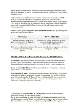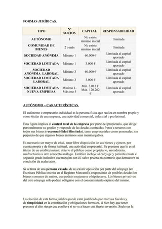 1) El documento describe diferentes formas jurídicas como el autónomo, sociedades civiles, comunidad de bienes, sociedad anónima, sociedad limitada y sociedades laborales. 2) Cada forma jurídica tiene un número mínimo de socios requerido, un capital inicial mínimo y una responsabilidad diferente frente a las deudas. 3) Algunas formas jurídicas como el autónomo y las sociedades civiles implican una responsabilidad ilimitada de los socios, mientras que otras como la sociedad anónima y limitada