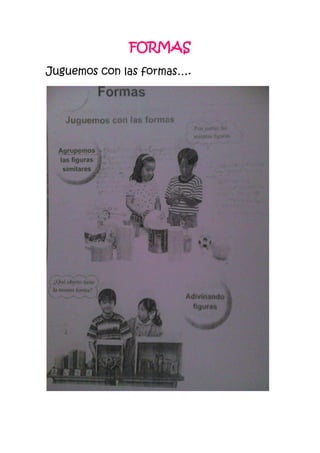 Este documento describe una actividad para niños que involucra formas geométricas. La actividad ayuda a desarrollar habilidades como la agrupación, clasificación y percepción. Al comparar objetos cotidianos con formas geométricas, los niños pueden reconocer las formas y empezar a entender conceptos abstractos.