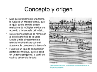 La fuga es una forma musical polifónica basada en un tema que se presenta y desarrolla a través de imitaciones. Se compone de una exposición donde se presenta el tema en cada voz, seguida de secciones de desarrollo donde el tema es modulado a diferentes tonalidades y episodios de diversión, y termina con una reexposición y coda final. La fuga emplea técnicas como la transposición y retrogradación del tema para explotar completamente sus posibilidades musicales.