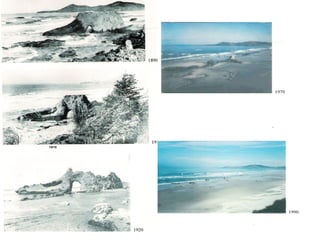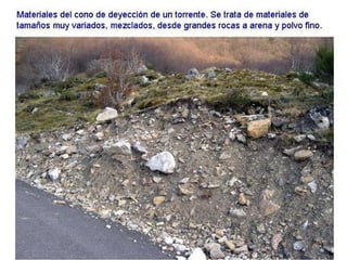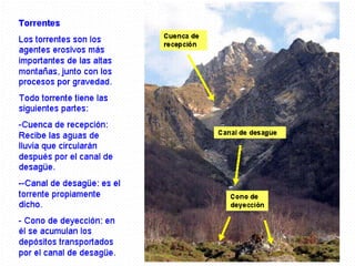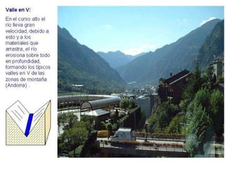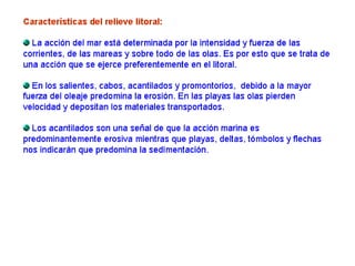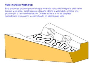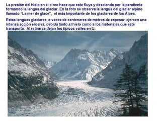 El documento describe diferentes procesos de modelado terrestre como el modelado eólico que incluye la deflación y abrasión que forman dunas, el modelado fluvial que erosiona las orillas de los ríos, el modelado glaciar que crea valles en U y circos glaciares, y el modelado litoral que forma acantilados y plataformas de abrasión a lo largo de las costas.