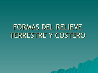 El documento describe 13 formas diferentes del relieve terrestre y costero. Incluye imágenes de montañas, valles, mesetas, llanuras, cordilleras, costas, acantilados, deltas, islas y otros accidentes geográficos que dan forma al paisaje de la Tierra.
