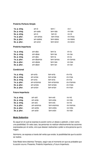 El documento establece las reglas de conjugación de los verbos en español a través de los modos infinitivo, indicativo, subjuntivo e imperativo, y proporciona ejemplos específicos para los verbos 'amar', 'temer' y 'vivir'. Se destacan las diferentes formas de conjugación según el tiempo verbal y el modo, incluyendo sus respectivas terminaciones. Además, se clasifica el modo indicativo en varios tiempos, mostrando la certeza de las acciones, mientras que el modo subjuntivo expresa deseos y posibilidades.