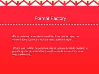 Format Factory es un software gratuito que permite convertir archivos de video, audio e imágenes entre diferentes formatos de manera sencilla. Ofrece opciones para cambiar el formato de salida de los archivos y ajustar la calidad de la codificación. Permite convertir videos a formatos como MP4, 3GP, MPG y AVI, así como convertir audio a MP3, WMA y WAV e imágenes a JPG, PNG y GIF.