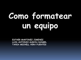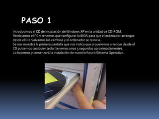 El documento proporciona un paso a paso para instalar Windows XP en un equipo. Explica los 29 pasos requeridos, que incluyen introducir el CD de instalación, crear y formatear una partición, configurar la fecha, hora y idioma, instalar componentes de red, y finalmente reiniciar el equipo para completar la instalación de Windows XP.