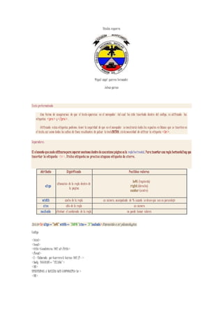 El documento describe las etiquetas <pre> y </pre> para preformatear texto en el navegador y mantener los espacios en blanco y saltos de línea. También explica la etiqueta <hr> para insertar una regla horizontal y sus atributos align, width, size y noshade. Finalmente muestra un ejemplo de código HTML con la etiqueta <hr>.