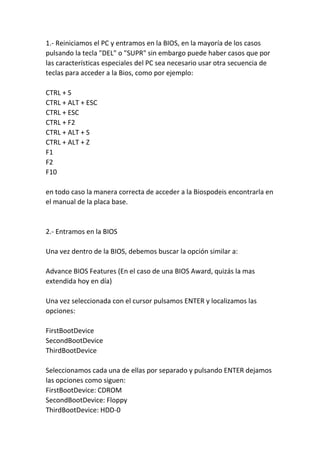 El documento proporciona instrucciones detalladas para configurar la BIOS para iniciar desde un CD-ROM, instalar Windows XP desde un CD en una partición nueva formateada, y completar los pasos básicos de configuración durante la instalación de XP.