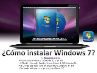 El documento describe los pasos para instalar Windows 7 en una PC. Estos incluyen configurar el BIOS para arrancar desde el DVD de instalación, insertar el DVD, aceptar los términos de licencia, formatear la unidad de disco duro seleccionada para la instalación, crear una cuenta de usuario y contraseña, e ingresar la clave de producto. Una vez completada la instalación, el sistema operativo estará listo para su uso.
