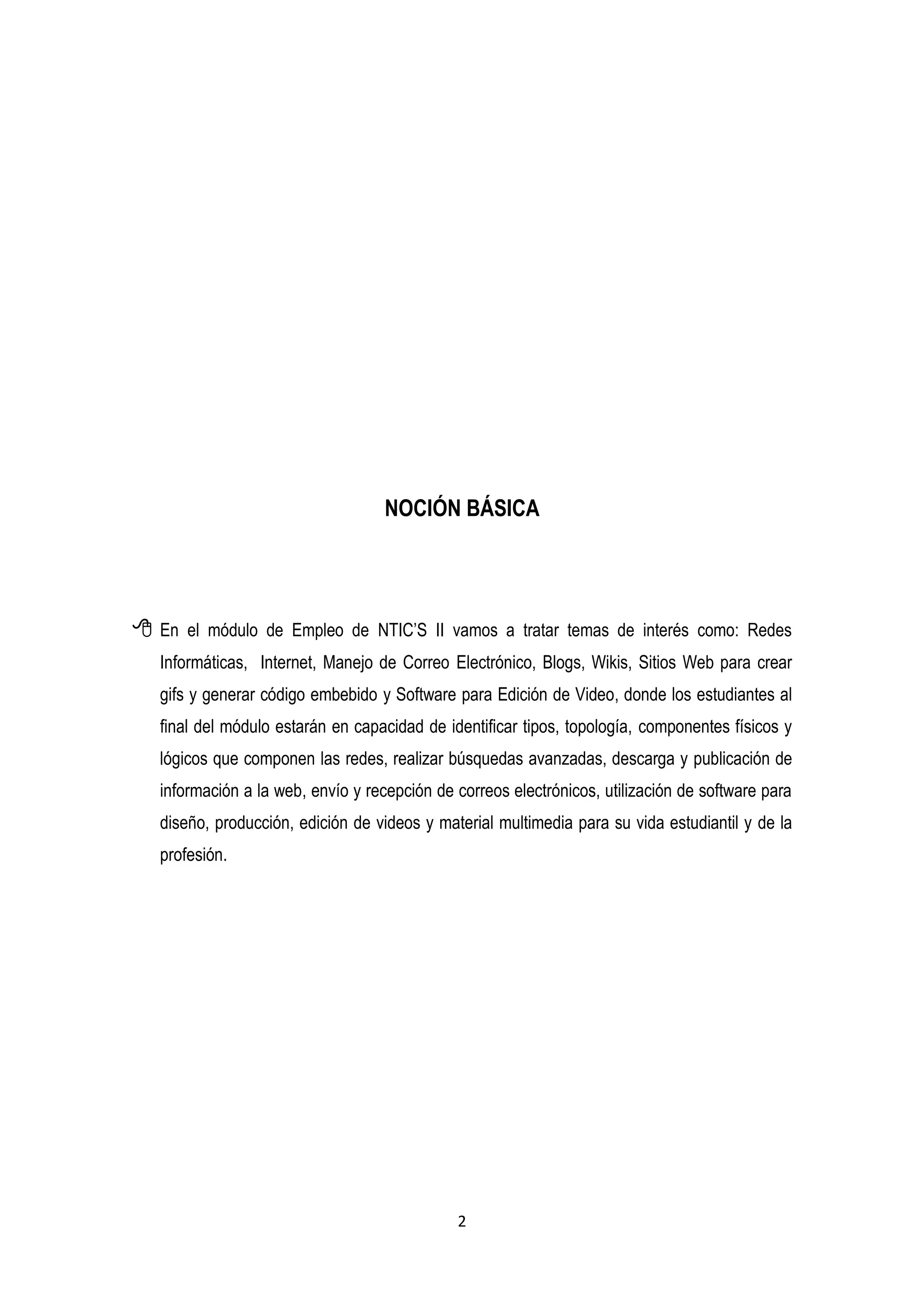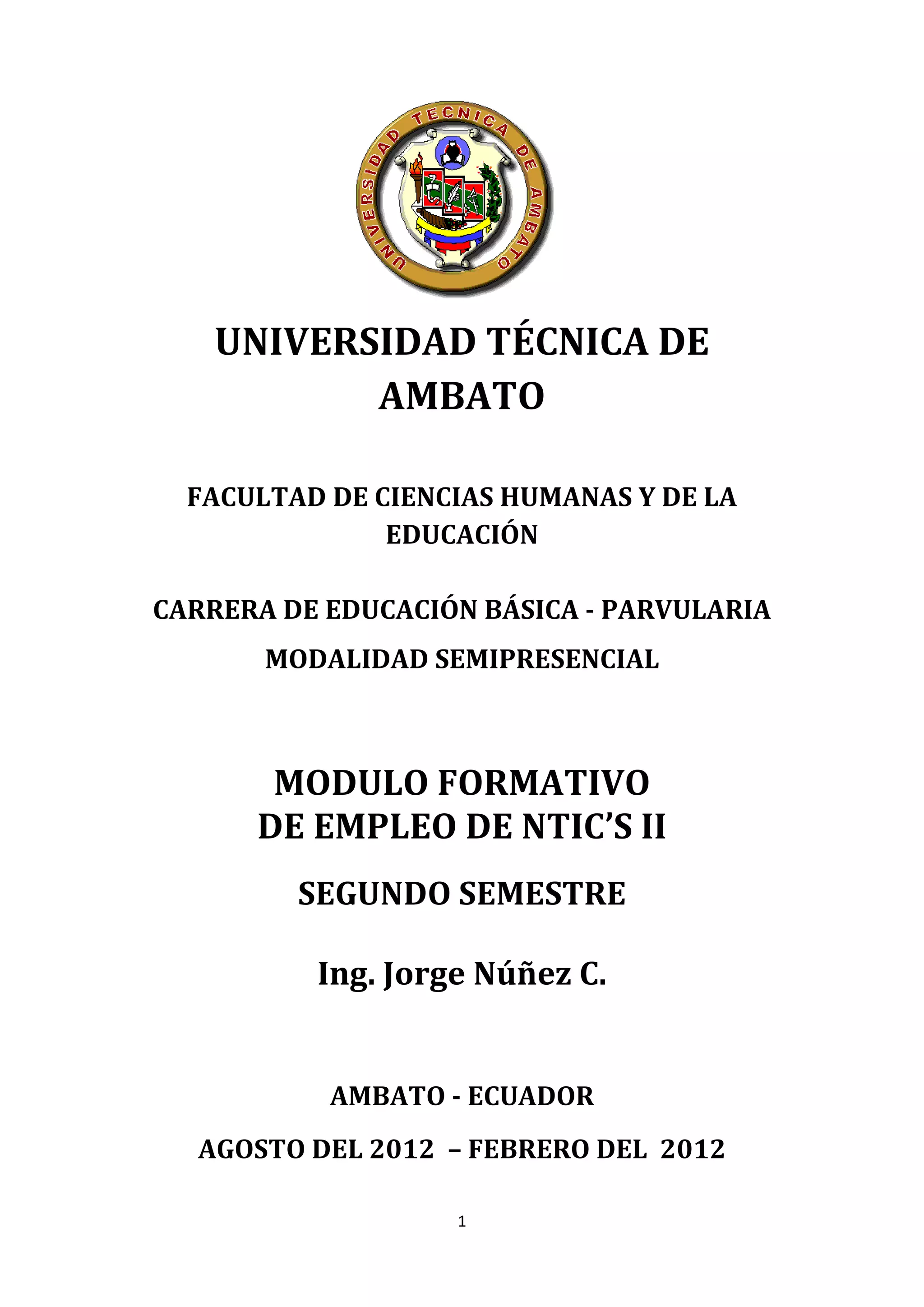 Este documento presenta la información básica sobre el módulo "Empleo de NTIC's II" que se impartirá en la Universidad Técnica de Ambato, Ecuador. El módulo abordará temas como redes informáticas, internet, correo electrónico, blogs, wikis y software de edición de video para que los estudiantes aprendan a identificar componentes de redes, realizar búsquedas en internet, y crear material multimedia interactivo.