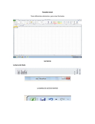 Este documento proporciona instrucciones sobre cómo usar Microsoft Excel. Explica las barras de herramientas y pestañas, cómo moverse entre hojas, introducir datos, guardar archivos y personalizar el entorno de trabajo. También incluye los nombres y correos electrónicos de dos estudiantes y su profesor.