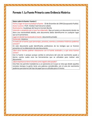 Estos documentos primarios incluyen actas de nacimiento, boletas de calificaciones escolares, y una fe de bautizo de entre 1961 y 1998 en México. Proporcionan información sobre personas, escuelas, y la iglesia en el pasado, y muestran cómo han cambiado los formatos y materiales de documentación a través del tiempo, ofreciendo una perspectiva histórica valiosa.