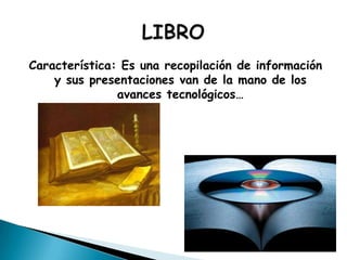 Este documento describe diferentes formatos para presentar información, incluyendo formatos, libros, revistas, carteles, objetos, pantallas y folletos. Cada formato se caracteriza por su propósito y estilo de presentación, ya sea recopilando información de manera impresa o virtual, siendo portátiles o de rápida lectura, permitiendo contenido inesperado o basándose en la estética del diseño o versatilidad interactiva.