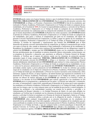 Este documento establece un convenio de cooperación entre la Universidad Francisco de Paula Santander y una empresa llamada Industrias El Conde. El convenio permite que estudiantes de la universidad realicen prácticas académicas y trabajos de grado en la empresa. El convenio define las obligaciones de la universidad, la empresa y los estudiantes para garantizar el éxito de las prácticas.