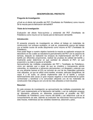 Este proyecto evalúa el efecto del PET como insumo en la mezcla para fabricar ladrillos. Se realizarán ensayos utilizando diferentes proporciones de picadillo de PET en la mezcla y se evaluará el comportamiento, las reacciones físico-químicas y variables como resistencia y absorción. El objetivo es aprovechar las propiedades del PET para reducir su impacto ambiental y aplicarlo en la construcción.