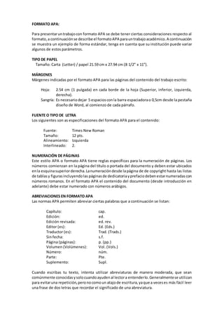 El documento describe el formato APA para trabajos académicos, incluyendo especificaciones sobre el tamaño y márgenes de papel, fuente y tamaño de letra, numeración de páginas e incluso abreviaturas permitidas. Se recomienda usar papel carta con márgenes de 1 pulgada y sangrar los párrafos 0.5 cm; la fuente debe ser Times New Roman tamaño 12 e interlineado doble. La numeración de páginas incluye números romanos para secciones preliminares y arábigos para el contenido
