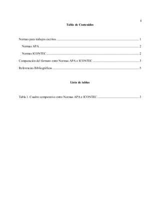 Este documento compara las normas APA e ICONTEC para trabajos escritos. Explica que las normas APA fueron creadas por la Asociación Americana de Psicología en 1929 y se especializan en citaciones, mientras que las normas ICONTEC son colombianas creadas en 1979. Luego, presenta una tabla comparativa que muestra las diferencias en formato entre ambas normas, incluyendo detalles sobre el tipo de papel, letra, márgenes, numeración, partes del trabajo y citaciones.