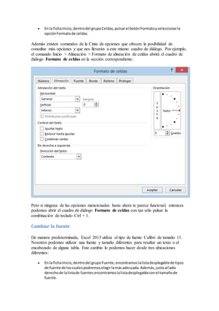 El documento explica las diferentes herramientas en Excel para dar formato a las celdas, incluyendo opciones para cambiar los bordes, el color de relleno, la fuente, y la alineación. Se pueden acceder a estas opciones a través de la cinta de opciones, la mini barra al hacer clic derecho, o el cuadro de diálogo de formato de celdas. También se pueden aplicar estilos predefinidos de celdas para cambiar fácilmente el formato.