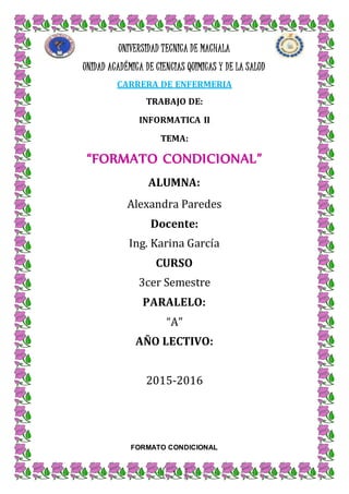 Este documento describe cómo usar formatos condicionales en Excel para aplicar formatos automáticamente a celdas basado en sus valores. Explica que los formatos condicionales permiten cambiar el formato de una celda si cumple una regla, como tener un valor entre ciertos números o si una fórmula devuelve verdadero. Luego detalla los pasos para crear formatos condicionales personalizados o usar formatos predeterminados como barras de color o iconos. Finalmente, explica cómo eliminar las reglas de formato condicional.