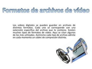 Este documento describe los formatos más utilizados para almacenar videos digitales, incluyendo AVI, MPG, QuickTime, WMV, RM, y FLV. Cada formato se asocia con una extensión de archivo específica y admite diferentes códecs de compresión que afectan la calidad y el tamaño del archivo.