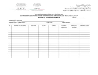 Este documento es un registro de asesorías académicas para un centro de estudios tecnológicos en Veracruz. Contiene encabezados con información de la institución educativa y campos para capturar datos como el nombre del alumno, semestre, grupo, turno, fecha de la asesoría, firma del alumno y observaciones. El docente firma para validar la información y hay un espacio para la firma de recibido.