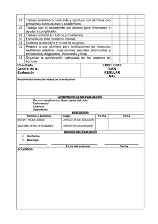 Este documento es una autoevaluación de un maestro en la que se evalúan 33 indicadores agrupados en categorías generales y académicas. Los indicadores incluyen el cumplimiento del horario, comunicación con directores, padres y estudiantes, entrega oportuna de planes de estudio y evaluaciones, y el desempeño en el aula. Al final, el director y director académico evalúan el desempeño general del maestro como excelente, bueno o regular/malo y se incluyen recomendaciones y observaciones adicional