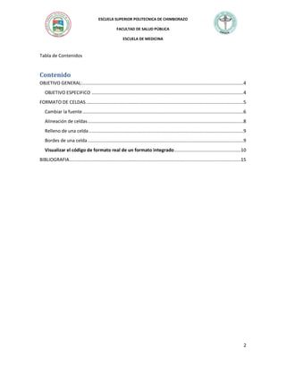 Este documento describe las funciones de formato de celdas en Excel, incluido cómo cambiar la fuente, alinear celdas, agregar relleno y bordes. El objetivo es conocer y aplicar estas herramientas de formato para mejorar la presentación de datos y agilizar el trabajo. Se explican opciones de formato disponibles en la cinta de opciones, menú contextual y cuadro de diálogo de formato de celdas.