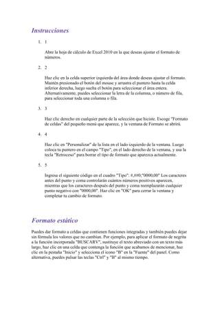 Este documento describe cómo dar formato a celdas que contienen funciones incorporadas en Microsoft Excel para mejorar la visualización de los valores de salida. Explica que el formato de celdas permite modificar el tipo de letra, tamaño y otras características del contenido de las celdas. También cubre el uso del formato estático, condicional y numérico para funciones como SUM, HORA y MONEDA a fin de identificar más fácilmente los valores y rangos críticos.