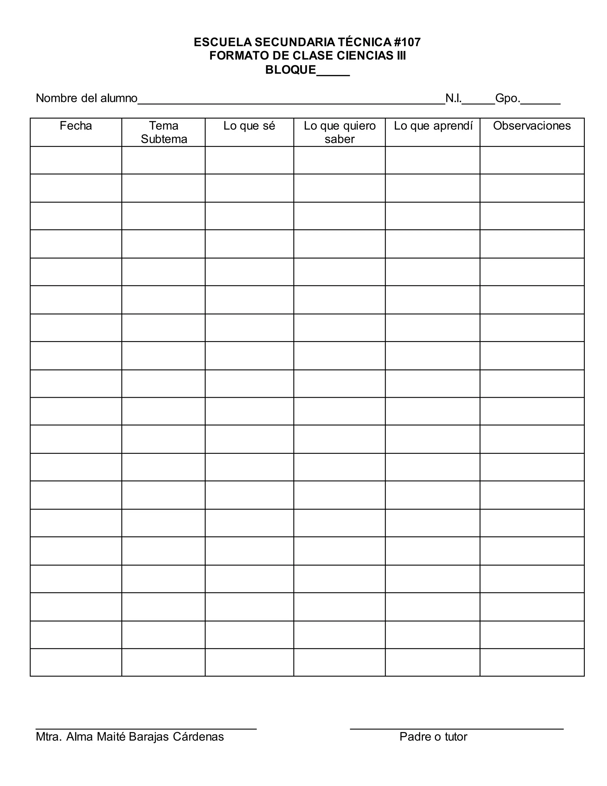 Este formato de clase para Ciencias III en la Escuela Secundaria Técnica #107 registra la fecha, el tema y subtema cubiertos en cada clase, así como lo que los estudiantes ya sabían, querían aprender y finalmente aprendieron sobre cada tema, con espacio para observaciones del maestro.