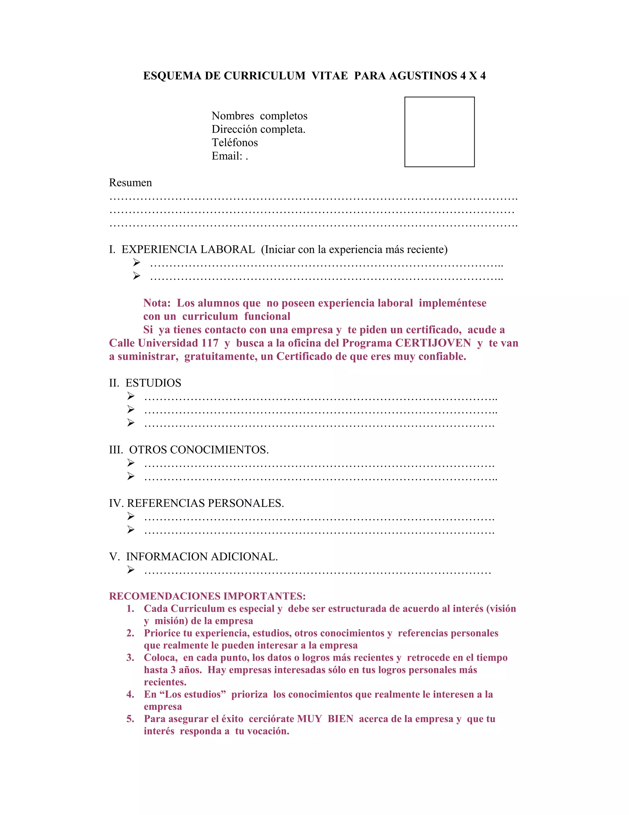 Este documento proporciona un esquema de currículum vitae para estudiantes que incluye secciones para la información de contacto, experiencia laboral, estudios, otros conocimientos, referencias personales e información adicional, además de recomendaciones para completar el currículum vitae.