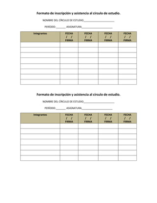 Este documento es un formato de inscripción y asistencia para un círculo de estudio. Contiene espacios para anotar el nombre del círculo de estudio, el período, la asignatura, los nombres de los integrantes y sus firmas para registrar la asistencia a las sesiones.