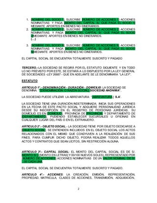 Este documento presenta un modelo de constitución de una sociedad anónima (S.A.) con aporte dinerario. Detalla la información de los socios fundadores, el capital social suscrito y pagado, el estatuto de la compañía incluyendo su objeto social, órganos de gobierno y facultades, y nombra al primer directorio.