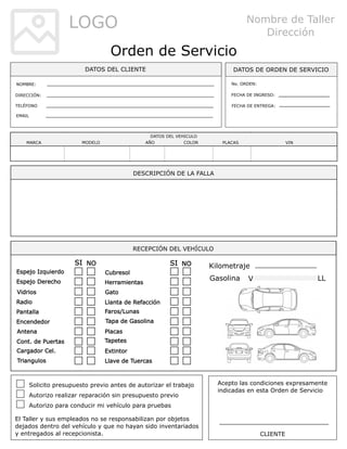 Este documento es una orden de servicio para reparación de un vehículo. Contiene secciones para ingresar datos del cliente, del vehículo a reparar e información sobre la falla reportada. También incluye términos y condiciones como la no responsabilidad por objetos dejados en el vehículo y la necesidad de autorización del cliente para realizar las reparaciones.
