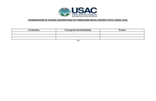 La coordinación del Sistema Universitario de Formación Inicial Docente (SUFID) de la Universidad de San Carlos de Guatemala (USAC) publicó un cronograma de actividades para la formación inicial docente que incluye contenidos y un sistema de punteo.