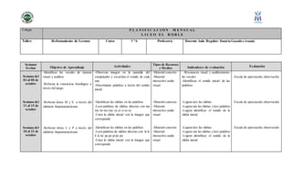 Este documento presenta el plan de estudios mensual de un taller de reforzamiento de lectura para diferentes cursos. Detalla los objetivos de aprendizaje, actividades, recursos y métodos de evaluación para cada semana. Los objetivos incluyen el reconocimiento de vocales, consonantes y sílabas, así como la comprensión lectora a través de la lectura de textos. Las actividades involucran juegos, lectura individual y en grupo. Se utilizan diversos materiales como libros, presentaciones y recursos interactivos. La evaluación se realiza mediante observación
