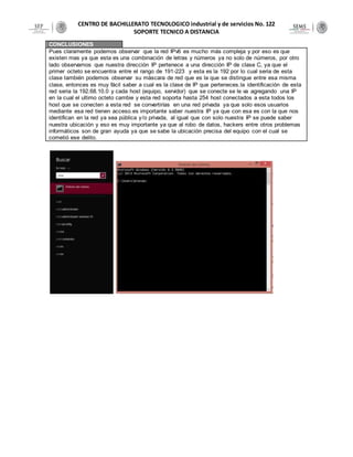 La práctica describe el protocolo IPv4, incluyendo su significado, funciones y clases. Explica cómo usar el comando "ipconfig" para ver la dirección IPv4, máscara de subred y puerta de enlace predeterminada de un equipo. Concluye que la dirección IPv4 del alumno pertenece a la clase C y que conocer la dirección IPv4 es importante para la identificación y ubicación de un equipo en una red.
