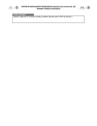 Este documento describe cómo usar el comando "ipconfig" en Windows para ver la dirección IPv4 asignada a una computadora. Explica que IPv4 es el estándar actual para identificar dispositivos en Internet y que cada dispositivo y sitio web tiene una dirección IPv4 única. El procedimiento incluye abrir el símbolo del sistema, ejecutar el comando "ipconfig", e identificar el tipo de dirección IPv4 y máscara de red asignadas.