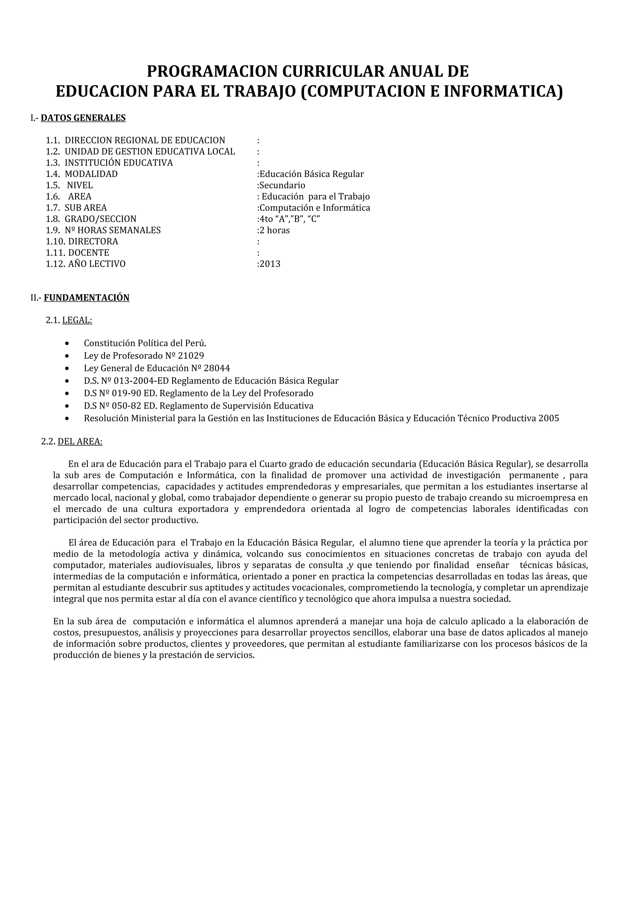 Este documento presenta el plan de estudios anual para la asignatura de Educación para el Trabajo (Computación e Informática) en el cuarto grado de secundaria. El plan describe los objetivos, contenidos, cronograma y métodos de evaluación para seis unidades didácticas sobre Excel y Access. El objetivo es desarrollar habilidades técnicas y actitudes emprendedoras en los estudiantes a través de la enseñanza práctica de herramientas informáticas.