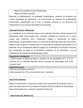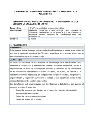 Este documento presenta un proyecto pedagógico que busca mejorar la construcción y comprensión de textos en estudiantes de 4° y 5° grado a través del uso de las TIC. El proyecto se llevará a cabo durante 2 meses en una institución educativa en Colombia e involucrará a docentes y estudiantes. Se proponen tres actividades como lecturas interactivas, elaboración de textos y uso de herramientas multimedia para leer y escribir. El proyecto evaluará el aprendizaje de los estudiantes a través de