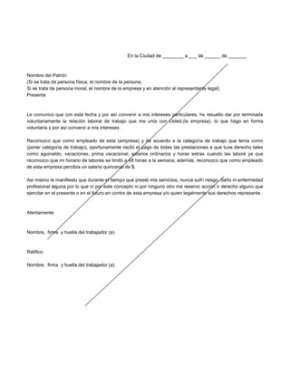 Este documento es una carta de renuncia voluntaria de un empleado a su trabajo. En la carta, el empleado comunica que renuncia voluntariamente a su puesto por convenir a sus intereses personales. Reconoce haber recibido todas las prestaciones adeudadas como aguinaldo, vacaciones y salarios. También declara no haber sufrido daños o enfermedades relacionadas con su trabajo.