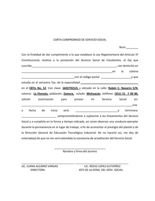 El documento presenta los formatos y requisitos para realizar el servicio social obligatorio. Se solicita el servicio social en una dependencia oficial u organismo, se presenta una carta de compromiso y aceptación, y se describen los informes bimestrales y el informe final que debe entregar el alumno, así como la constancia de terminación.