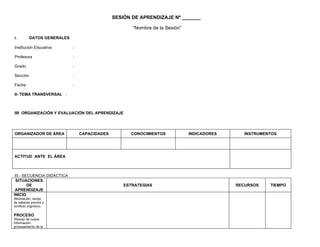 Este documento presenta la planificación de una sesión de aprendizaje. Incluye detalles sobre la institución educativa, profesora, grado y fecha. Además, describe la organización y evaluación del aprendizaje, la secuencia didáctica con situaciones de aprendizaje, estrategias, recursos y tiempo, y las referencias utilizadas.