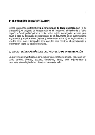 Este documento proporciona instrucciones para elaborar proyectos de investigación. Explica que un proyecto de investigación debe incluir una descripción general, un título, el objeto de estudio, el estado del arte, los ámbitos temáticos, el problema práctico y de investigación, la justificación, las preguntas y objetivos de investigación, el marco teórico, las hipótesis, el tipo de investigación, la metodología, las técnicas, los resultados esperados, y una lista de referencias. También describe cada uno de est