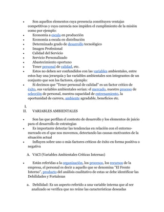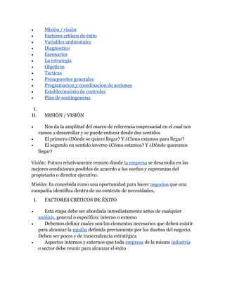 El documento describe las diferentes etapas de planificación estratégica de una empresa, incluyendo la misión, factores críticos de éxito, análisis del entorno, diagnóstico, escenarios, estrategia, objetivos, tácticas, presupuestos, programación y control. La estrategia se define tras analizar las fortalezas, debilidades, oportunidades y amenazas para lograr los objetivos a corto, mediano y largo plazo a través de planes operativos y presupuestos departamentales.