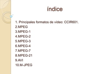 Los principales formatos de video discutidos incluyen CCIR601, MPEG (incluyendo MPEG-1, MPEG-2, MPEG-3/MP3, MPEG-4), AVI, y M-JPEG. Cada formato tiene características diferentes como la tasa de bits, calidad de video, capacidades de compresión, y soporte de audio multicanal. MPEG ha establecido varios estándares ampliamente adoptados para codificar video y audio digital.