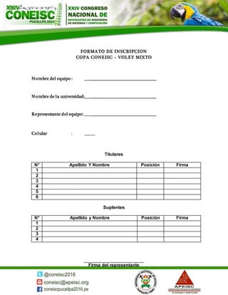 El documento contiene dos formatos de inscripción para dos competencias deportivas universitarias. El primer formato es para la Copa Coneisc de fútbol y solicita los nombres del equipo, universidad, representante, números y datos de los titulares y suplentes. El segundo formato es para la Copa Coneisc de voley mixto y pide la misma información.